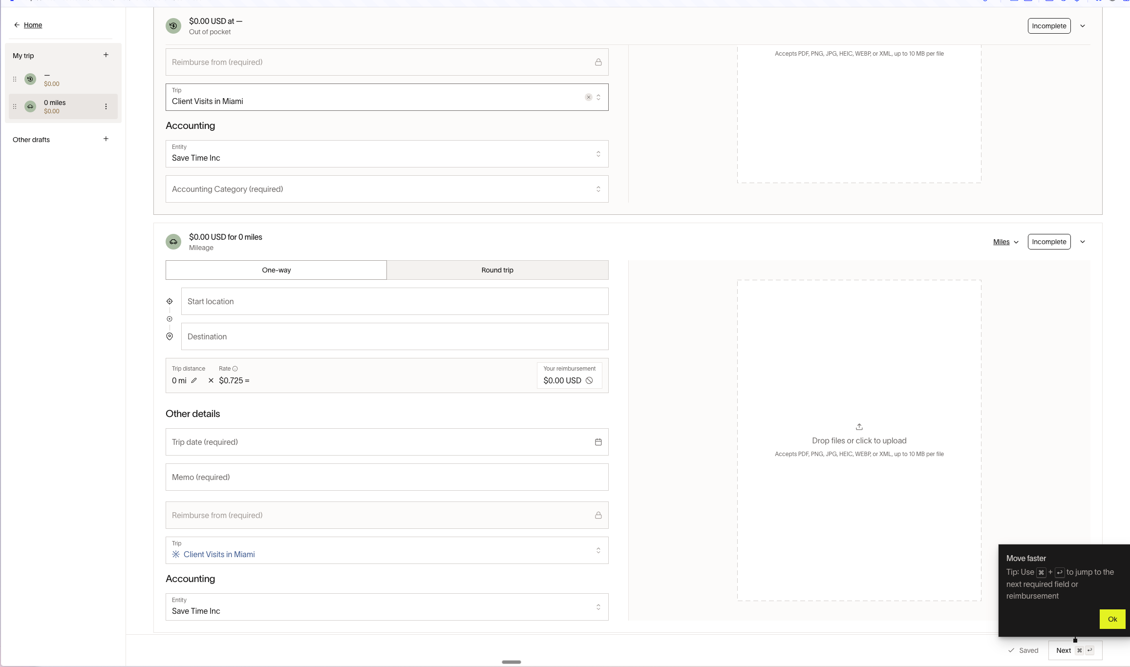 Regarding trip optionality - this can be alleviated by setting up an expense policy that’s condition on which fund you’re spending from. For example, if you travel infrequently, but those travel expenses are for client visits, it may make sense for your admin to set up a “Client Visits” fund that requires trip. Then, for your general expenses, trip can remain optional.