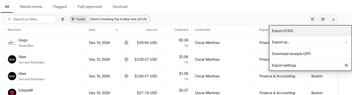Hi David! If I understand correctly, Ramp does offer the ability to download receipts in bulk. You can download receipts in bulk by going to the “Expenses” tab, selecting either “Transactions” or “Reimbursements,” and downloading. You can filter by trip, cardholder, department, etc. (examples below), and download the results by those groups.