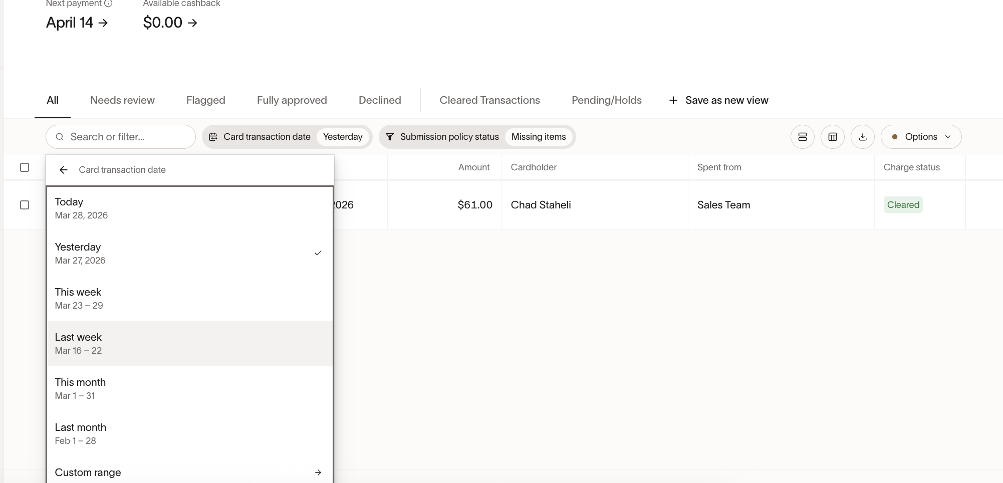 It would be AMAZING to have the abiloty to select a date filter for when the transaction date is older than X days, currently i can select TODAY, or YESTERDAY, or THIS WEEK, THIS MONTH, LAST MONTH, or a custom range, however this isnt ideal when i want to make a dynamic saved list of all expenses where it is older than 3 days and is still missing items.