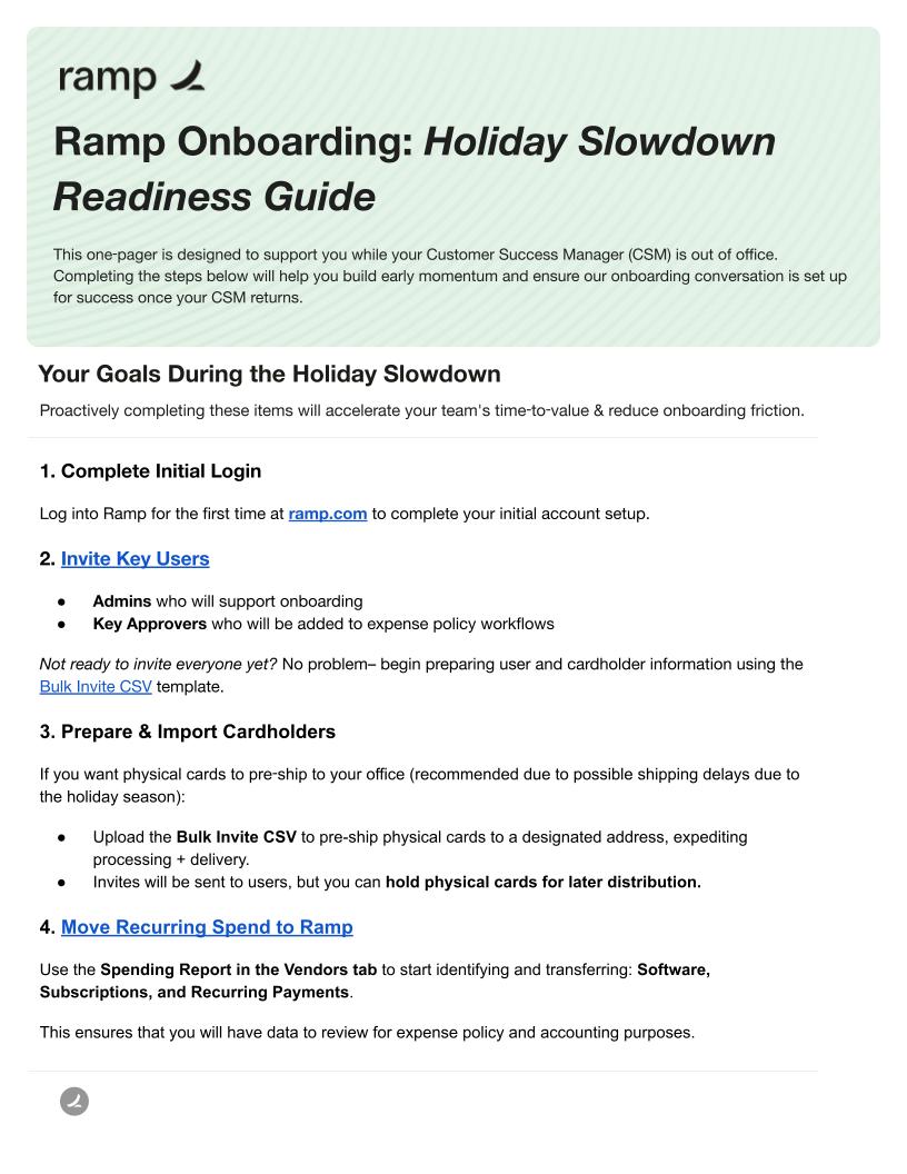 Whether you’re navigating out-of-office schedules or looking to get a head start on 2026, our Holiday Readiness guide below is designed to help you stay confident and set yourself up for success during the Ramp Holiday Slowdown period.